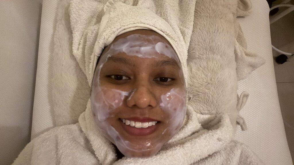 Sebelum rawatan bermula, aku dipakaikan bathrobe putih bersih, rambut dibalut kemas, dan diposisikan dengan selesa di katil rawatan.